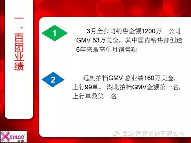2016年4月6日,經(jīng)過了激烈的百團(tuán)大戰(zhàn)后,我公司3月全公司銷售金額為1200萬。公司GMV 53萬美金,其中國內(nèi)銷售部創(chuàng)造6年來最高單月銷售額。另外遠(yuǎn)奧拍檔GMV 總業(yè)績160萬美金,上行99單。 湖北拍檔GMV金額第一名,上行單數(shù)第一名。阿里巴巴武漢分公司召開了“大武漢生態(tài)百團(tuán)表彰大會”,我公司的林總經(jīng)理和外貿(mào)部經(jīng)理秦小姐被邀請到了現(xiàn)場接受表彰,在這次百團(tuán)大戰(zhàn)中,我公司員工士氣高漲,奮起拼搏,在大家的努力下,我公司獲得了“最佳一拍檔”,”先鋒戰(zhàn)隊(duì)“的榮譽(yù),我們的林總經(jīng)理獲得了”最佳牛師獎“,我們的秦小姐獲得了”百萬英雄“的榮譽(yù)稱號,此時正在公司拼搏的英雄們,收到這個消息后,都很是興奮,沒有什么比努力受到了認(rèn)可更讓人感到欣慰的了。